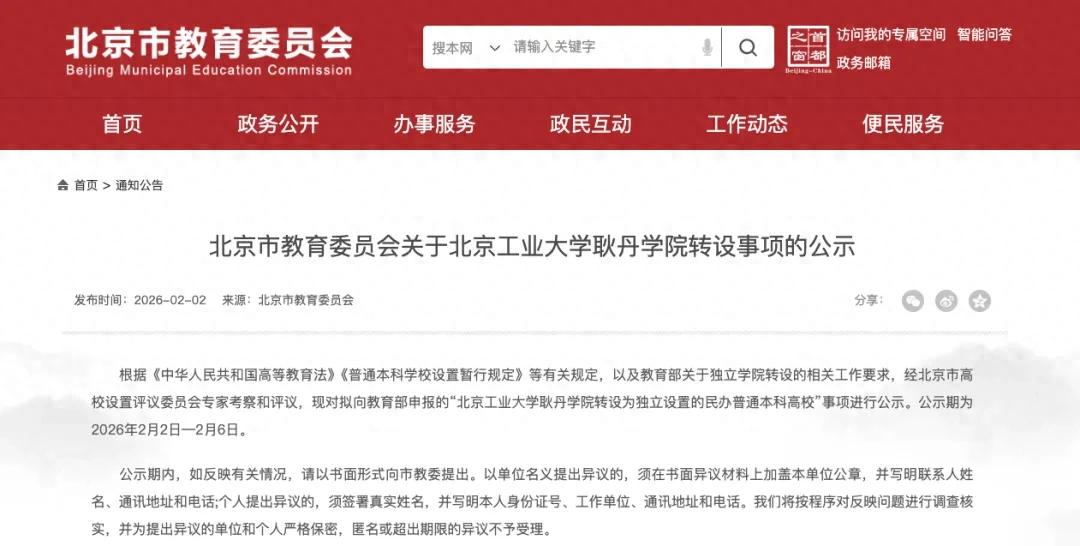 根据《中华人民共和国高等教育法》《普通本科学校设置暂行规定》等有关规定,以及教育部关于独立学院转设的相关工作要求,经北京市高校设置评议委员会专家考察和评议,现对拟向教育部申报的“北京工业大学耿丹学院转设为独立设置的民办普通本科高校”事项进行公示。公示期为2026年2月2日—2月6日。