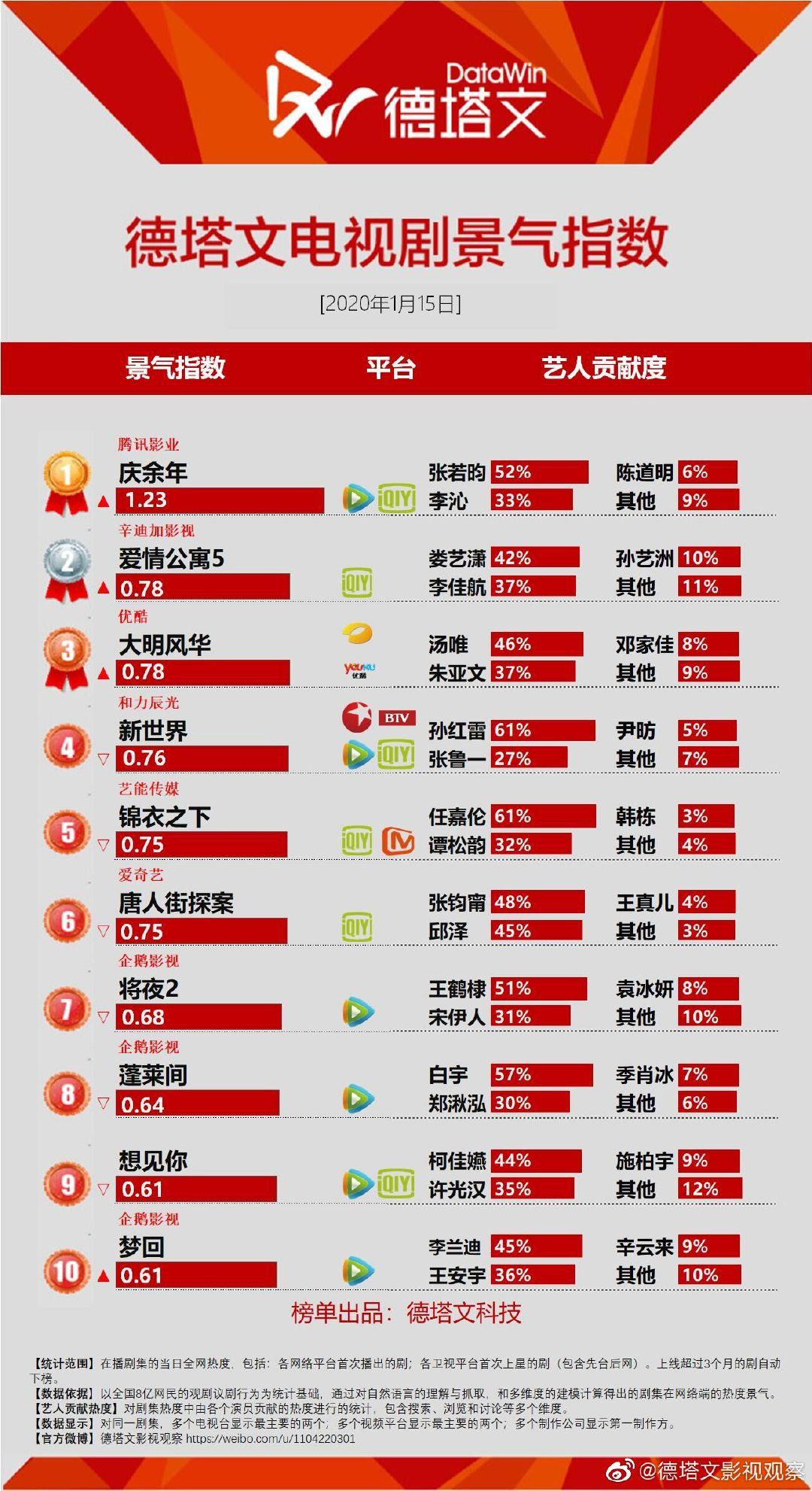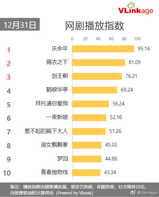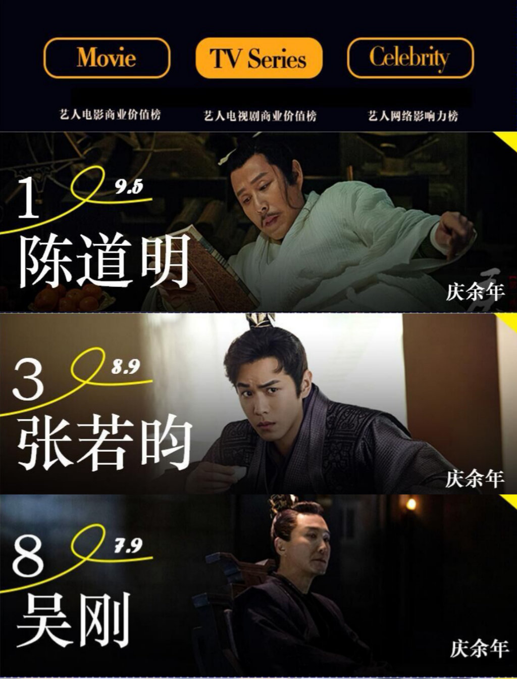 《庆余年》播出即爆款,迅速荣登各大榜单收视榜首,豆瓣评分8.0,张若昀“庆国男团”C位出圈,喜提艺人电视剧商业价值排行榜前三:
