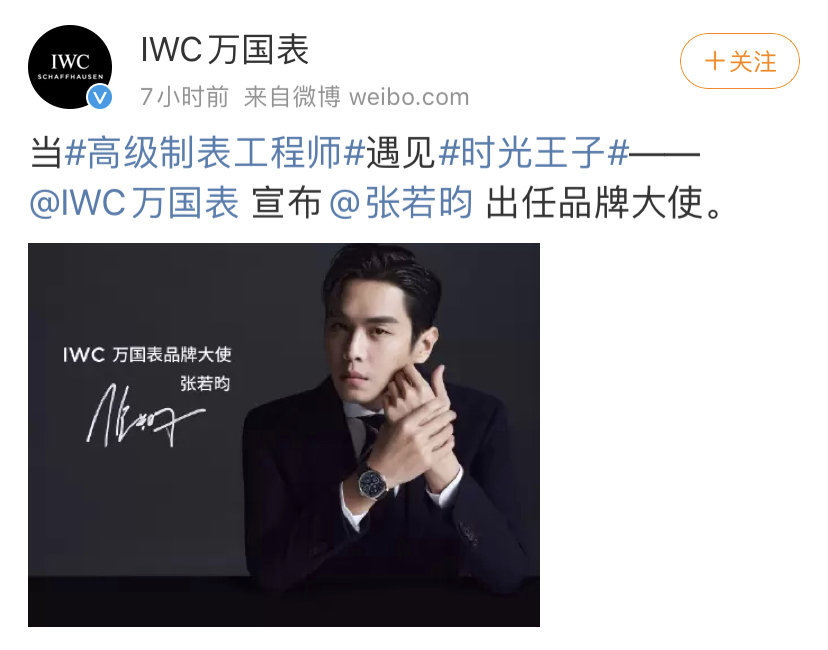 4月20日,IWC万国表微博官宣张若昀出任其品牌大使: