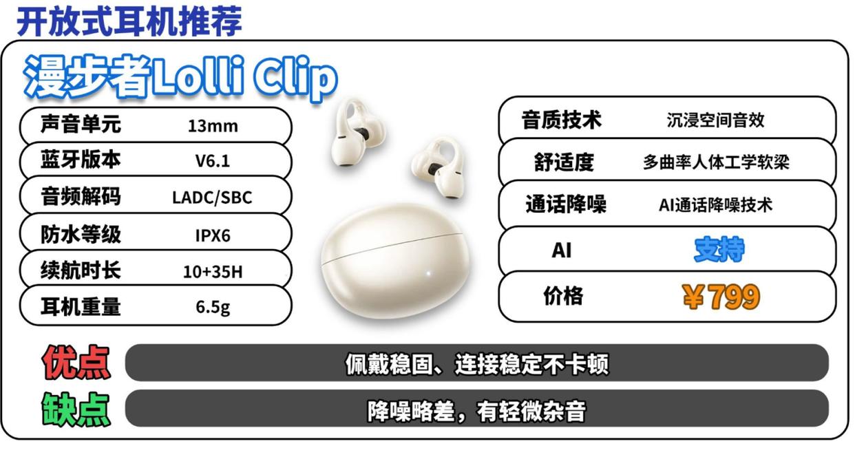 支持蓝牙6.1与LDAC高清音频,连接稳定性好,在适配机型上能提供卓越的无线音质体验,但与非适配设备连接的音质优势会打折扣。其AI通话降噪功能能有效提升通话清晰度。续航表现扎实,单次10小时,综合续航达35小时,并具备IPX6级防水。整体来看,漫步者Lolli Clip是一款在连接技术和中高频音质解析上有突出表现的耳夹式耳机,尤其适合追求高清音频细节、且需要长续航与可靠防护的用户。其在低频表现和音质适配门槛方面的局限,也值得潜在用户注意。