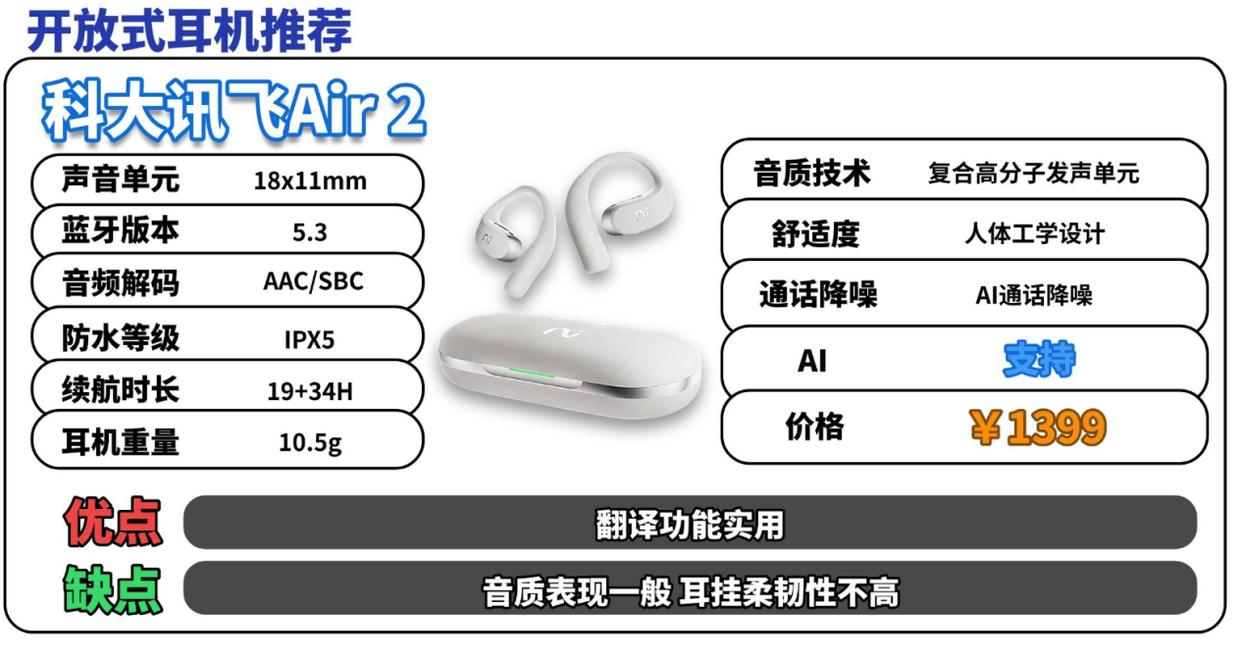 配置上,科大讯飞Air 2支持蓝牙5.3版本,连接稳定。该耳机还配备了AI通话降噪功能,能智能滤除环境噪音,确保通话语音清晰。续航表现突出,单次充电可使用19小时,结合充电盒总续航可达53小时。采用磁吸充电方式,并具备IPX5等级的防水能力,足以应对日常汗水与雨水侵袭。此外,它还支持AI智能助手,提供2项AI功能,增强了使用的便捷性与智能化体验。