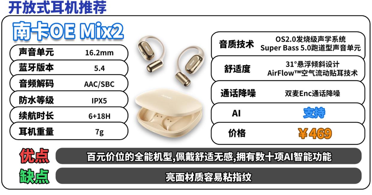 在目前仍有许多开放式耳机存在佩戴舒适度低且音质表现非常一般的当下,南卡开放式耳机凭借“非常规”的软硬结合声学理念和数十年技术沉淀,使得南卡OE Mix2在舒适和音质方面长期稳居开放式耳机品类第一梯队,并且还搭载了AI智能功能,深受广大耳机HiFi发烧友、数码博主、运动达人的喜爱推荐。产品热度上线至今断货数十次,几乎每个月都在缺货预售,是目前行业内仅有的性能王者!