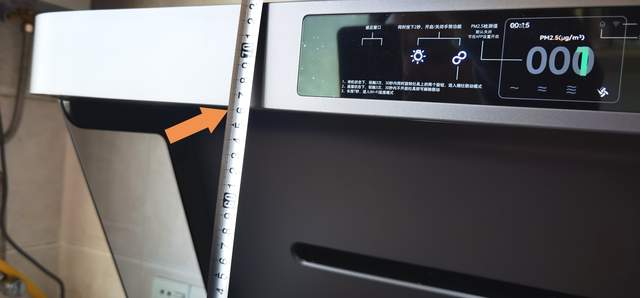 操作和显示面板功能丰富,几乎囊括了操作、显示和功能状态的大部分信息。从左到右依次为,感应窗口、LED灯开关、设置、显示窗口(左上角时间显示、右上角烟灶联动指示灯和WiFi指示灯、中间时间显示和PM2.5显示、最底下是档位显示)、切换、开关、感应窗口,保护膜上详细注释了各项功能和操作步骤。面板上方蜂窝状的开孔,是PM2.5感应窗,检测空气环境状态。