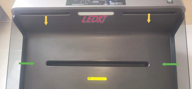 有别于传统的中式和欧式油烟机的顶置油烟口,这款侧吸一字式的油烟口,所有的油烟都是通过一字排烟道。自己脑子里曾经设想,如上图,感觉两边有隔板,可以物理防油烟散失,但是正面没有挡板,如果油烟多跑到一字的上方,特别容易散出去。甚至买的时候看官网的动图,都没有想到是什么原理不让油烟从正面扩散出去。收到了我才发现,在LED灯两边有两个出风口,一直在往下吹风,把散到上面的烟气又吹回到一字吸油烟口的位置,达到油烟不扩散的目的。