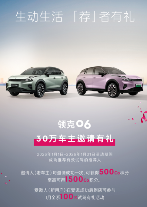 里程碑不仅是阶段的总结,也是新一轮互动的开始。为回应30万台交付达成的用户支持,领克06推出为期一个月的邀请有礼活动。2026年1月期间,老车主每成功邀请新用户试驾,即可获得500Co积分,最多可获1500Co积分。新用户到店后同样享有试驾礼遇。通过实际激励促进用户体验与分享,让交付数字真正转化为用户可感知的回馈。
