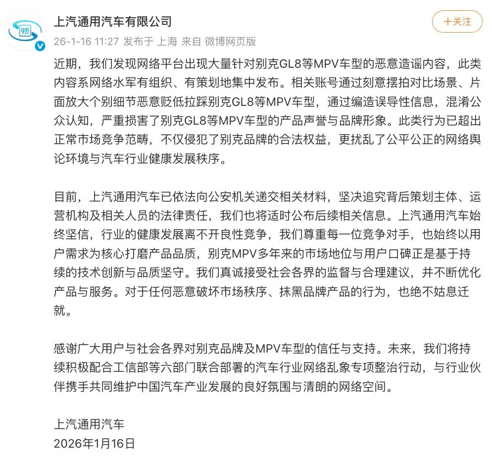 面对抹黑,上汽通用也忍不了了。1月16日,上汽通用发布声明称,近期网络平台出现大量针对别克GL8等MPV车型的恶意造谣内容,此类内容系网络水军有组织、有策划地集中发布。