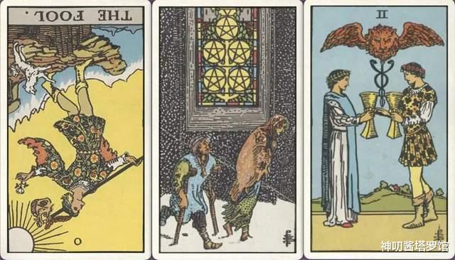 牌:愚人- 星币五+ 圣杯二+