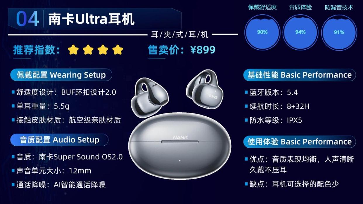 南卡在国产耳机里算是老牌了,尤其在开放式和耳夹式耳机领域积累了不少经验。Ultra系列承袭了南卡一贯的高标准,从元器件选择到成品调音都有严格把控。品牌理念不追求夸张音效,而是稳扎稳打地提升整体听感和舒适度,尤其适合日常通勤、办公以及轻度运动场景。