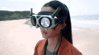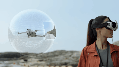 在该航迹规划模式之下,将Vision眼镜递给同伴,他们不仅能实时看到你规划的航迹画面,还能通过头部转动“临时接管”视角,可让他们置身于你打造的空中旅程,同步观看无人机实时传输的全景画面,亲身体验一把身临其境的飞行。