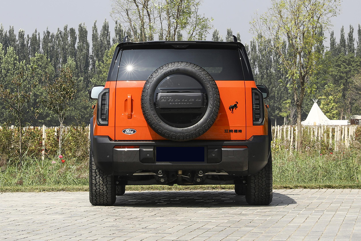 车尾部分,后尾门使用了侧开式的结构,带有背挂式的备胎。后杠造型和前相呼应,看上去很粗犷硬朗。