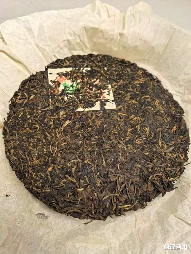 这批茶也是按照传统8582配方压制而成,饼面较大,选用三至八级粗壮茶菁压制,外形圆厚,条索肥壮,粗字繁体厰内飞埋压在茶饼里。