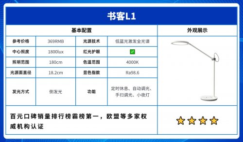 护眼台灯排行榜第五名:书客L1(推荐指数:⭐⭐⭐⭐)
