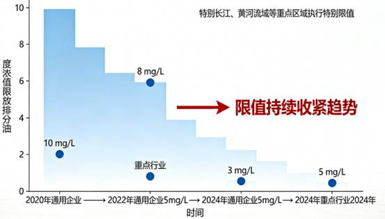 重点行业(化工、石油炼制):限值从 5mg/L 降至 2mg/L,挥发性石油类指标首次纳入管控,限值≤1mg/L;
