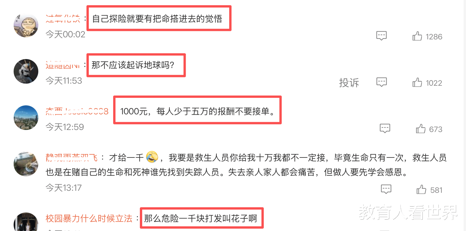 “1000元真大,用命搜救。”“那不应该起诉地球吗?”“少于五万的报酬千万别接单。”