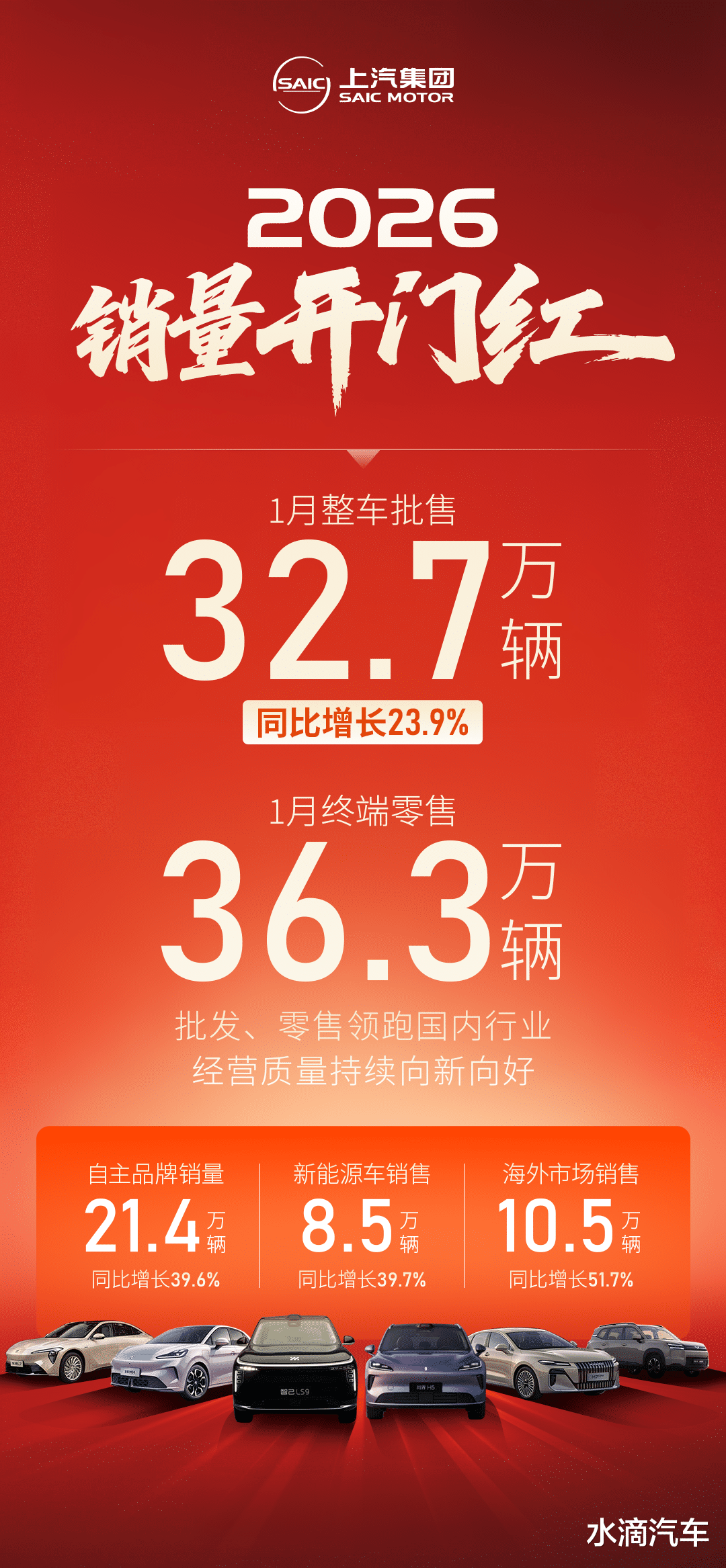 (2026年2月2日,上海)上汽集团发布1月销量数据,继去年全年整车销量实现同比两位数增长后,2026年上汽集团再迎市场开门红:1月实现整车批售32.7万辆,同比增长23.9%,终端零售36.3万辆,批发、零售销量规模双双领跑国内汽车行业,经营质量持续向新向好。其中,上汽自主品牌销售21.4万辆,同比增长39.6%;新能源车销售8.5万辆,同比增长39.7%;海外市场销售10.5万辆,同比增长51.7%。