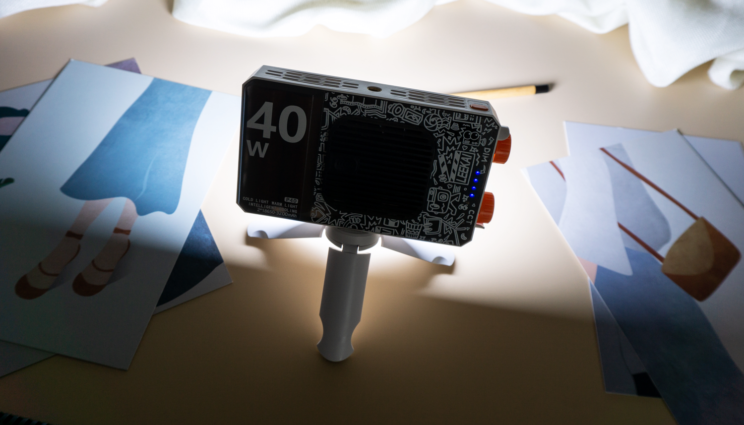 当我双击开关按键时,口袋灯会进入到全功率40W输出状态,背面的指示灯亮起醒目的红色。此时亮度达到峰值,足以应对各种高强度补光需求,当然续航时间也会相应缩短到45分钟左右。
