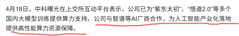 智普算力提供商:公司与智谱华章召开战略合作发布会,双方明确将在智能算力集群、大模型商业化、一体机研发、国产GPU适配及地方智算中心建设等多个关键领域展开深度合作。公司是智谱华章的算力提供商,将充分受益于智普新一代大模型用户需求激增带来的算力需求。
