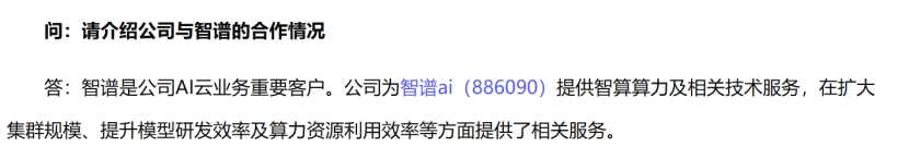 智普算力提供商:智谱是公司AI云业务重要客户。公司为智谱ai提供智算算力及相关技术服务,在扩大集群规模、提升模型研发效率及算力资源利用效率等方面提供了相关服务。将充分受益于智普新一代大模型用户需求激增带来的算力需求。