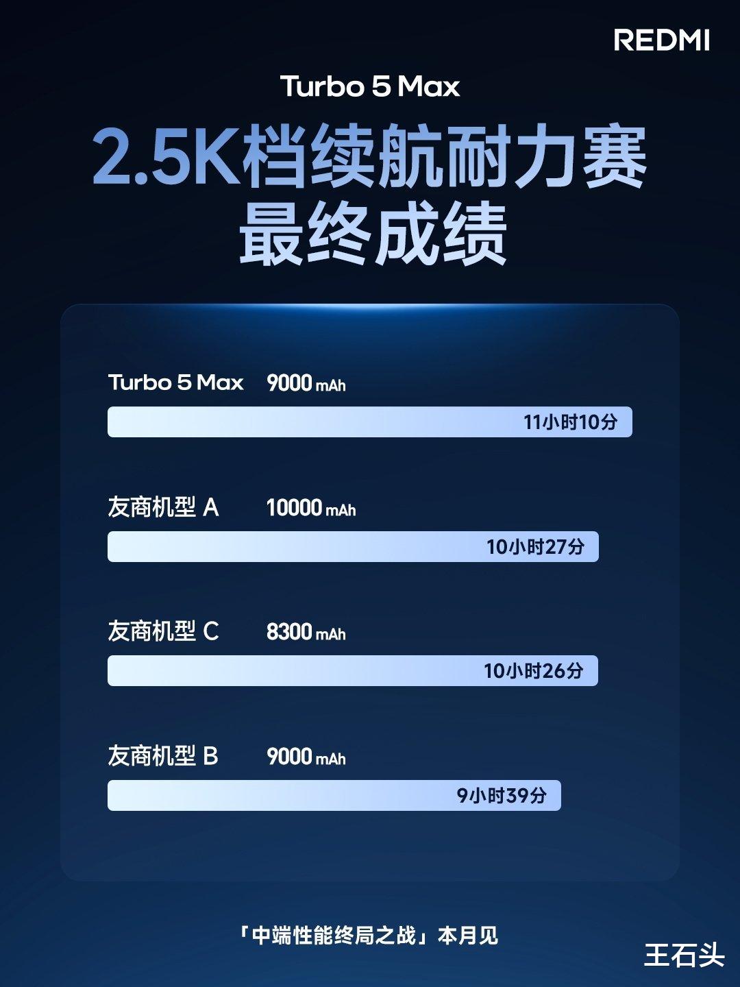 结果不出意外,Turbo 5 Max的续航表现非常出色,凭借更小的电池,居然领先了第二名友商10000mAh机型43分钟。