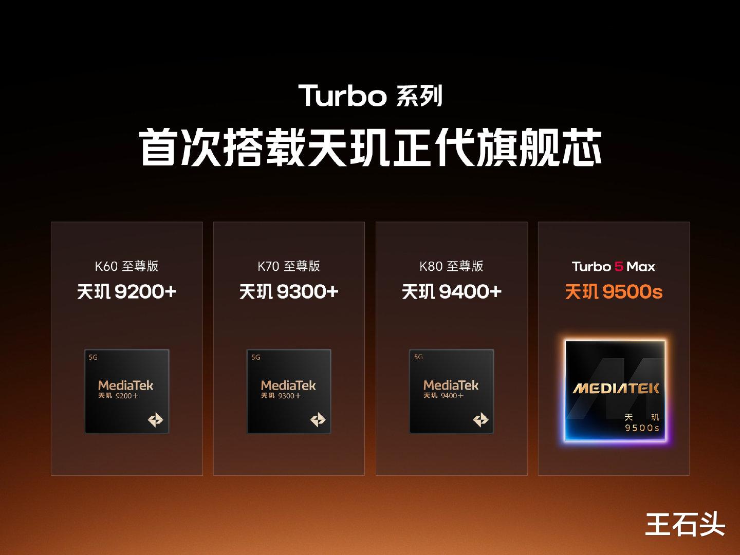 光续航强,那不成“板砖”了?性能方面,Turbo 5 Max更猛,它全球首发了联发科的天玑9500s芯片,而且是REDMI和联发科一起“量身定做”的。