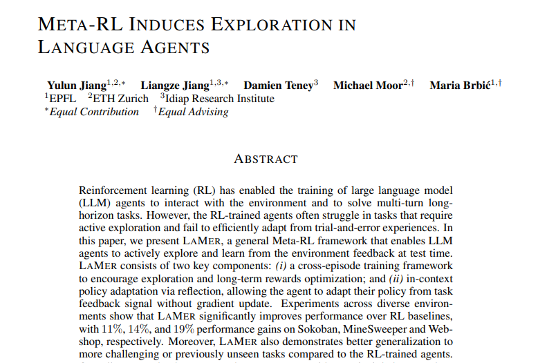 最近,一个由斯坦福大学、苏黎世联邦理工学院和Idiap研究所组成的国际研究团队,在这个难题上取得了重大突破。他们的研究成果发表于2025年12月18日的arXiv预印本平台(论文编号:arXiv:2512.16848v1),题为"Meta-RL Induces Exploration in Language Agents"。这项研究由江雨伦、江良泽等研究人员主导,他们开发出一种名为LAMER的全新框架,首次让AI智能体学会了在面对新环境时如何巧妙地平衡探索与利用,就像一个经验丰富的探险家一样。