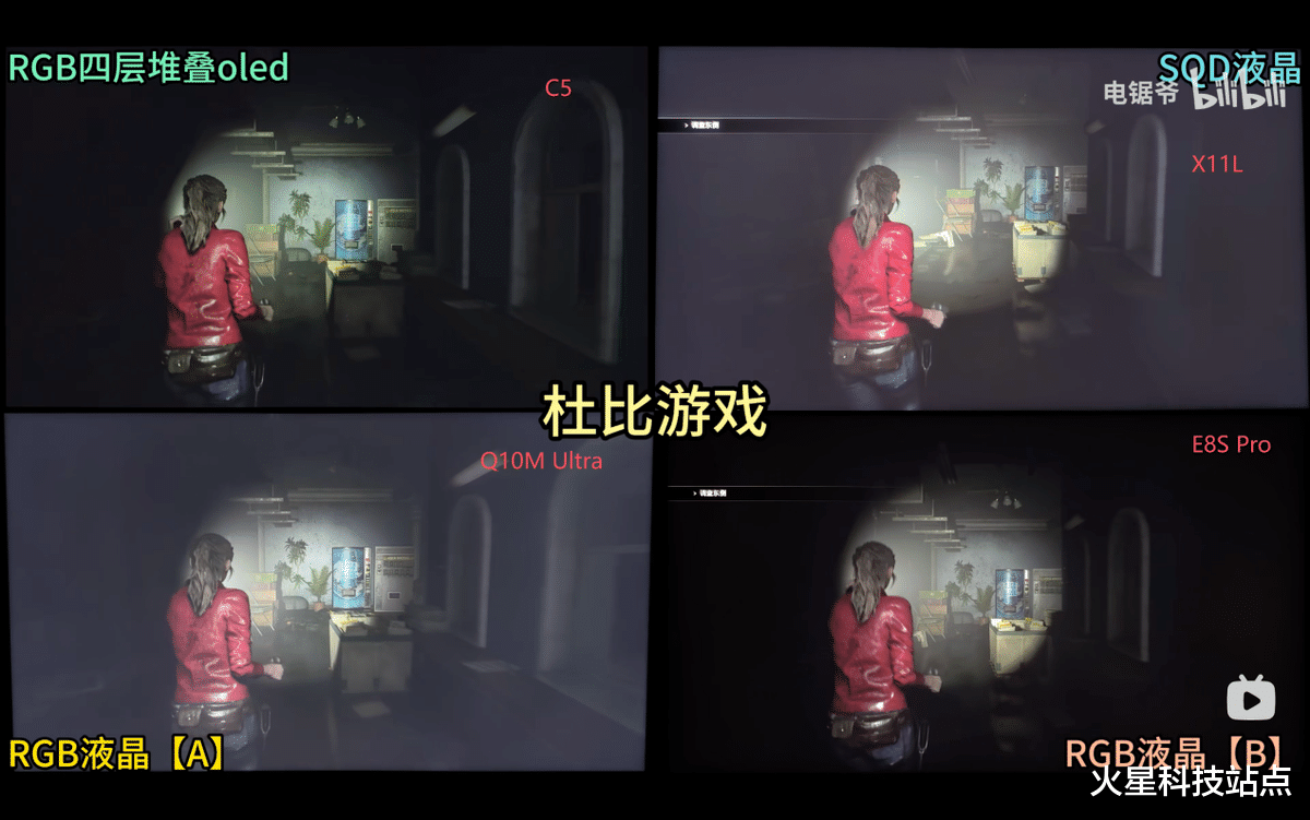 即便是在OLED占绝绝对优势的暗室画质方面,RGB-Mini LED的表现也是相当惊艳。在游戏大作《生化危机》的黑暗场景中,海信E8S Pro基于高分区设计和高亮度的优势,配合“极黑极透”的黑曜屏Ultra,画面通透不泛白,光照下的铁柜纹理、纸箱褶皱等细节清晰可辨,相比OLED的沉浸感更胜一筹。