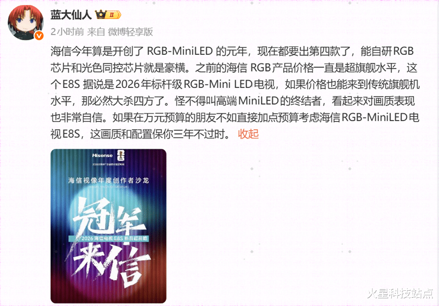 截至目前,海信已推出了UX、U7S Pro、E8S Pro三款RGB-Mini LED电视。而近期不断有科技大V透露,已经收到海信新品前测会的邀请,并爆料海信第四款RGB-Mini LED电视E8S很快就会上市,这款定位“2026标杆级RGB-Mini LED电视”的新品将延续其家族式的高端核心参数,旨在让更多大众家庭能够享受到旗舰电视的升级体验。大家对”高端Mini LED终结者”海信E8S有什么期望呢?感兴趣的朋友不妨持续关注这款新品的后续情况。