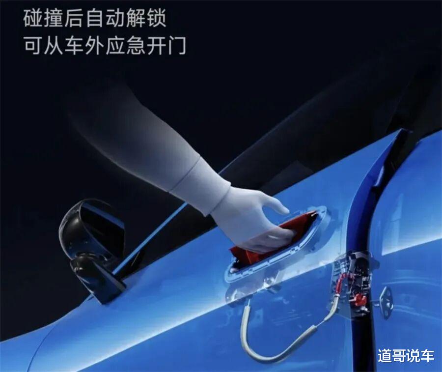 老款的半隐藏式门把手,里面就是一个电子微动开关。正常没问题,碰撞断电呢?2025年10月成都天府大道那起事故,四个路人冲上去救人,拳打脚踢打不开门,最后消防切割机才打开。