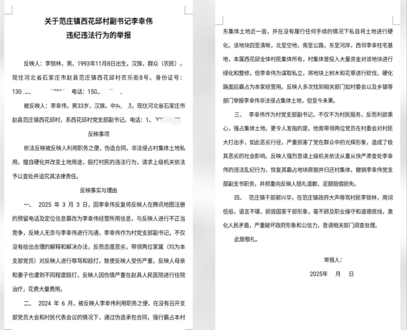 近日,河北省石家庄市赵县范庄镇西花邱村村民李锁林通过多种渠道反映,该村党支部副书记在任期间李幸伟存在多项疑似违规违纪行为,涉及集体土地处置、人身冲突等多个方面,相关情况引发当地村民及社会各界关注,有待相关部门介入核查。