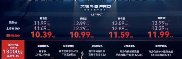 咱们先来说说这艾瑞泽8 PRO的价格吧。它的官方指导价从11.69万元起,这还不算啥,限时“红包价”竟然直接降到了10.39万元起。这就像是在平静的湖水里投下了一颗重磅炸弹,对于消费者来说,这无疑是个超级诱人的消息。你想啊,在这个价位能买到一款紧凑型车,而且还不是那种配置寒酸的车,是不是很心动呢?