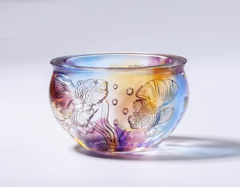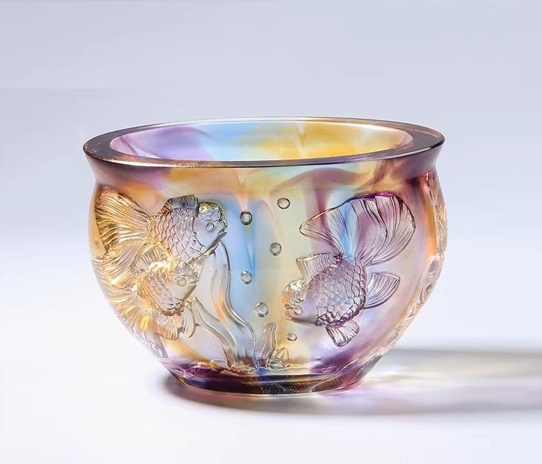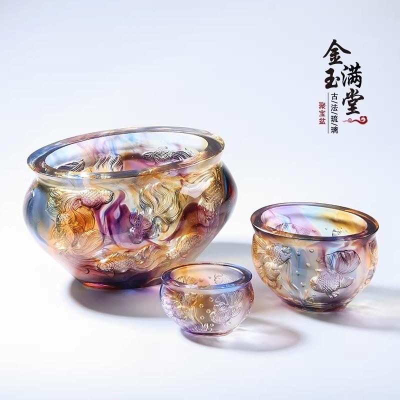 古法琉璃金玉满堂招财鱼聚宝盆,造型构思极为精巧,巧妙将多种祥瑞元素融为一体,既具工艺之美,又含吉祥之意。盆身整体圆润饱满,线条流畅柔和,无一丝生硬之感,尽显古朴雅致的东方韵味,而圆润的造型本身便寓意“聚财纳福、包罗万象”,象征着能汇聚世间福气与财富。盆中招财鱼身姿灵动、形态逼真,鳞片纹理清晰可辨,栩栩如生,仿佛下一秒便会游动起来。鱼在中华传统文化中素来是吉祥的象征,代表着“年年有余、吉祥顺遂”,搭配古法琉璃本身璀璨多变的色泽,更添几分祥瑞之气。“金玉满堂”的美好寓意,不仅是对财富丰足、生活优渥的真切期许,更是对家庭和睦、家人安康、事业兴旺的真挚祝愿,将传统工艺之美与中式吉祥之意完美融合,相得益彰。