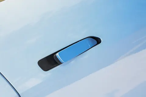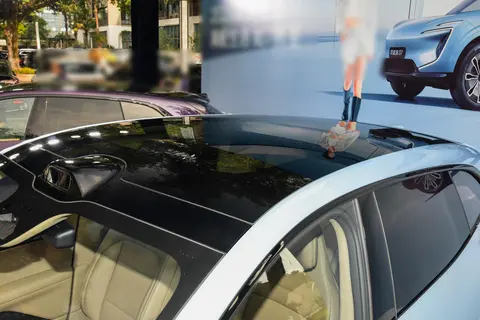 尾部的星轨式流光尾灯与前脸呼应,细腻的红光灯语在夜间形成独 特标识,而无框车门的设计则进一步强化了整车的精致感。车漆方面,除了经典的墨黑、漠白,新增的晴蓝配色采用哑光质感涂层,在阳光和店里的灯光下会呈现淡淡的渐变效果,兼顾了我们年轻人对个性化的追求与日常使用的耐脏性。值得一提的是,漆面采用水性3C2B工艺,8层涂层总厚度达150微米,其中70微米的2K清漆镀层具备日光自修复功能,细微划痕无需刻意处理便能自行恢复,让车辆长期保持鲜亮状态。