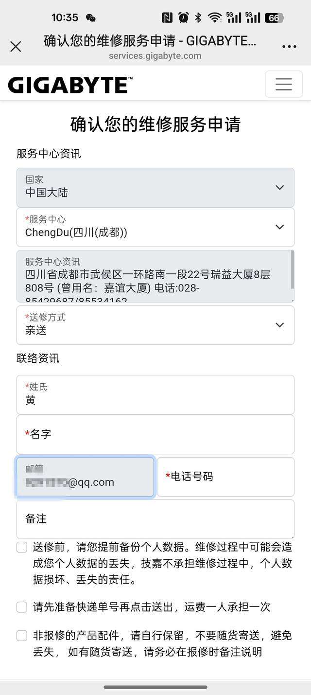 接下来就是填写自己这边的信息了,按照要求填写就可以了。由于本人所在地就有技嘉的售后维修点,所以这里就选择了亲送,顺便还可以看看技嘉售后的环境怎么样。