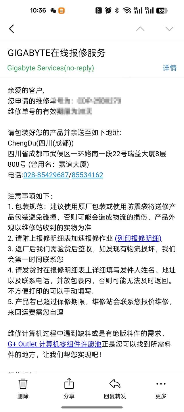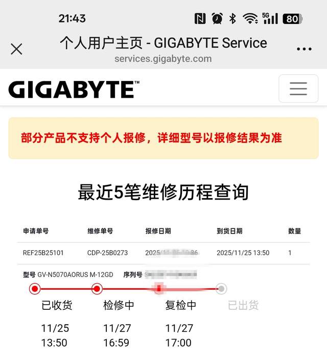 显卡是技嘉RTX 5070超级雕,想着一块这么好的显卡,就这么躺了肯定不合适。这时候朋友也是说,这块显卡还在保,而且技嘉显卡也是支持个人送保的。想着技嘉也有不错的售后,于是就尝试联系了售后,售后说在手机上操作就可以,但是要承担送修的费用,修好了技嘉会承担发货回来的费用。
