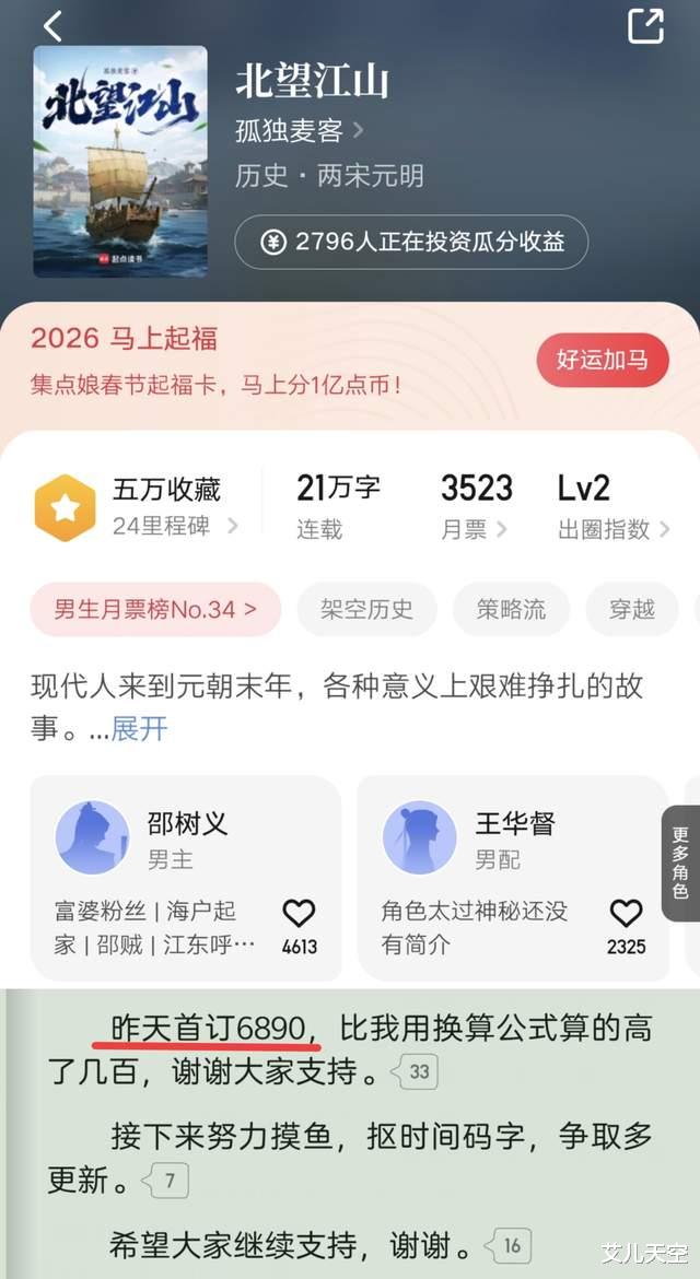 昨天除了文抄公这位大神,还有孤独麦客的新书《北望江山》也在中午上架的,元末争霸天下的题材,作者有透露首订6890。