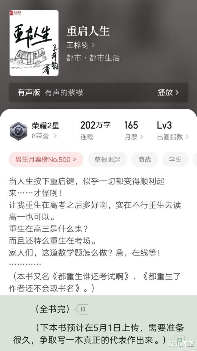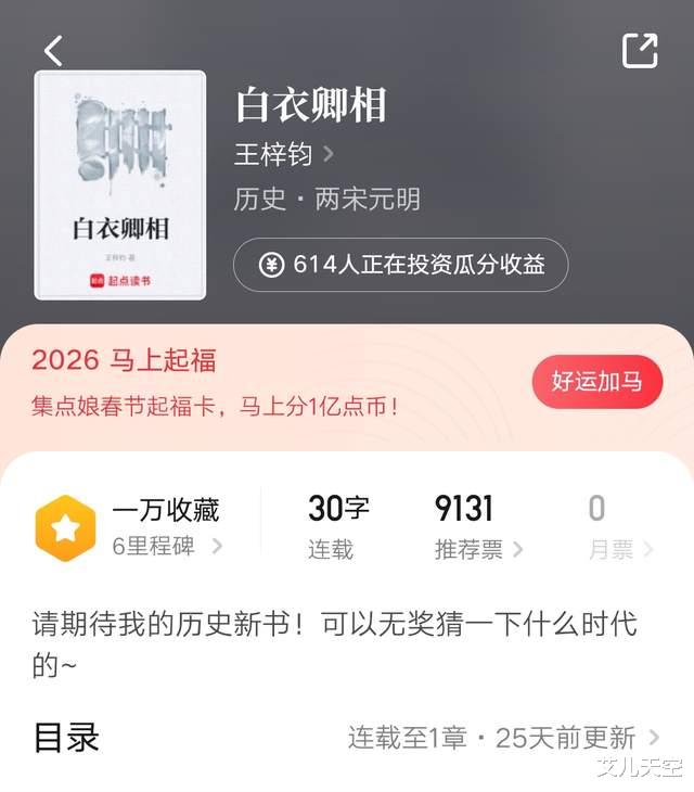 老王上个月完结了《重启人生》之后,就开了历史题材新书《白衣卿相》的预收藏,起点安排的完结活动里也有新书的预收藏。