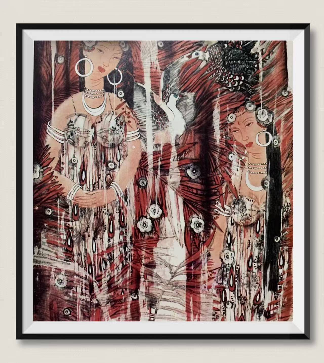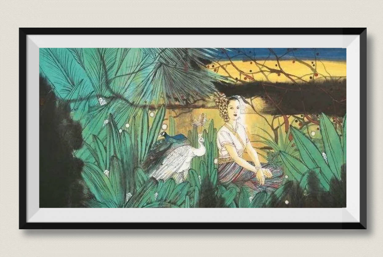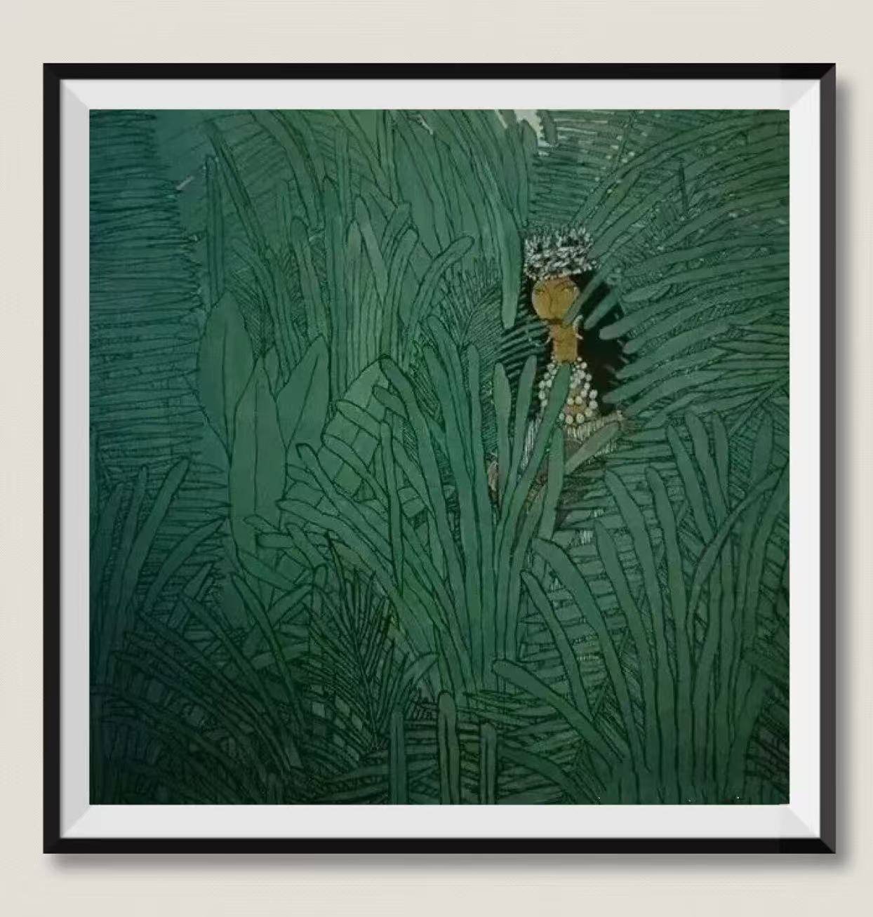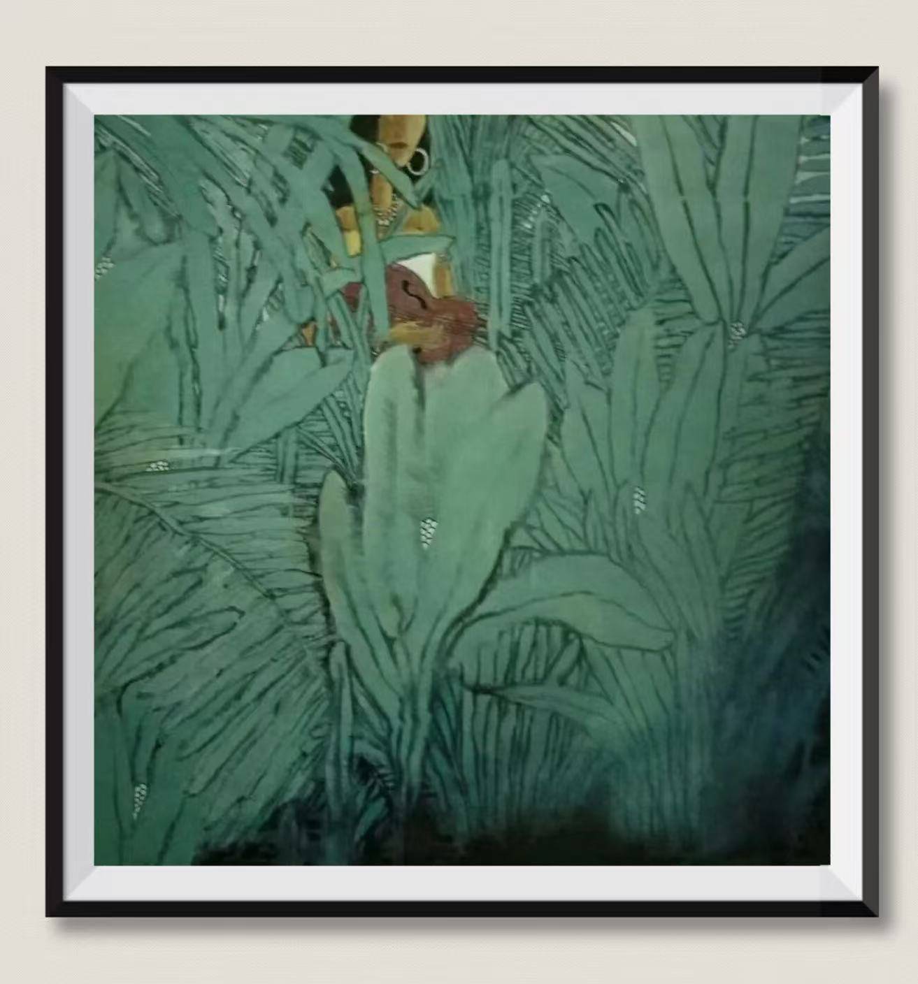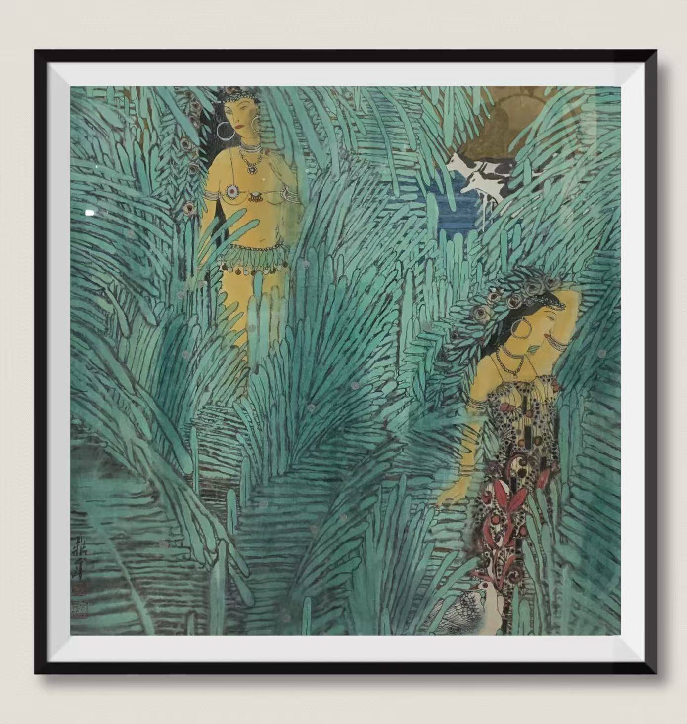 李鼎成的《雨林幻境》系列作品,根植并依托于西双版纳神奇而美丽的热带丛林及人文风情且以此为母体,融入了其东南亚诸地之旅的素材积累和毛里求斯等国之行的创作灵感,不拘于一时一地之景之物的描摹,打破和跨越了时空的概念,在现实主义基础上,以理想主义的浪漫情怀将不同时空的异域人文风情,以唯美之笔巧妙地融合于西双版纳的热带雨林之中,独造出源于西双版纳而又异于西双版纳等地的“雨林幻境”审美情境、个性艺术风格,并以抒情、唯美、浓郁、繁密且蕴含装饰意味和当代性的视觉图式子立于当代画坛。