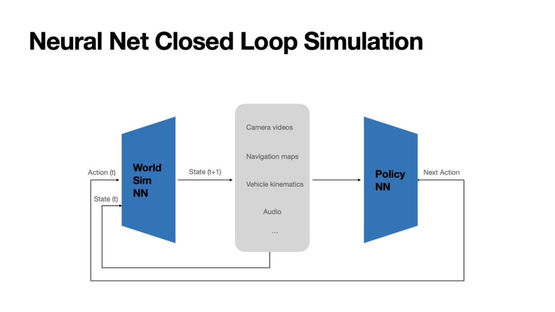 Elluswamy此次分享给出了关键信息:系统以视频为主的多模态输入进入端到端模型,直接输出控制指令,感知 - 预测 - 决策 - 控制在同一神经网络中耦合回传;这一整体框架与近期热议的“世界模型”思想高度相似。同时,在仿真侧,世界模型被用于生成对抗性场景,以实现闭环评测与迭代。