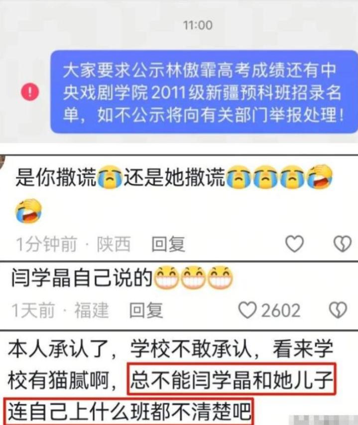 就在忘本的争议还没平息时,有网友质疑闫学晶的儿子是“高考走后门”上的中央戏剧学院。