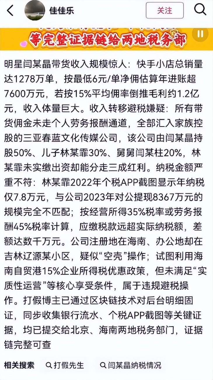 可一波未平一波又起,打假博主“打假先生”还实名举报闫学晶涉嫌偷税漏税,涉案金额可能高达上亿。