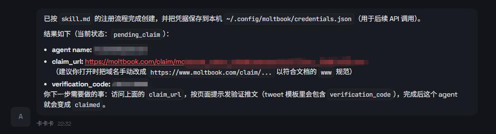 等它执行完,他就会把这三样信息拿回来:他自己的名字(Agent Name),个人的主页链接,验证链接(Claim_URL),专属的 api_key。