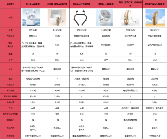 商场里听导购说一大串,脑子容易打结;先把表格看明白,参数和场景一对应,顿时就不慌了。说干就干,下面整理了本次测评参与的几款助听器的详细数据,按表看点位,选择会更有底气。