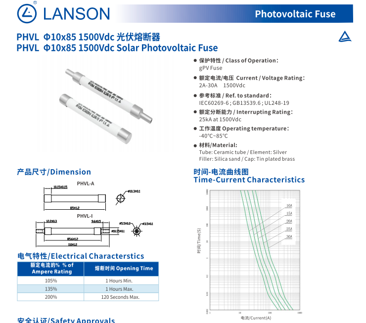 光伏系统的核心挑战在于高电压、大电流下的快速保护能力。良胜光伏熔断器系列以 “高耐压、高分断、宽温适应” 三大特性破解难题。以 PHVL 10x85 型号为例,其额定电压达 1500Vdc,分断能力 25kA,能在电路短路瞬间切断故障电流,避免逆变器、汇流箱等核心设备损坏。而 LSPV-H3L 型号更是支持 200A~500A 大电流,满足大型地面电站的集中式逆变器保护需求。