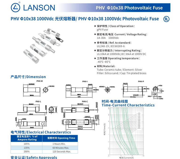 国际认证是良胜光伏熔断器走向全球的通行证。PHV10x38 系列获得 UL 认证(证书号 E495906),PHVL 系列通过 TUV 认证(证书号 R50488707),符合 UL248-19、IEC60269-6 等国际标准,已广泛应用于东南亚、欧洲、北美等地区的光伏项目。