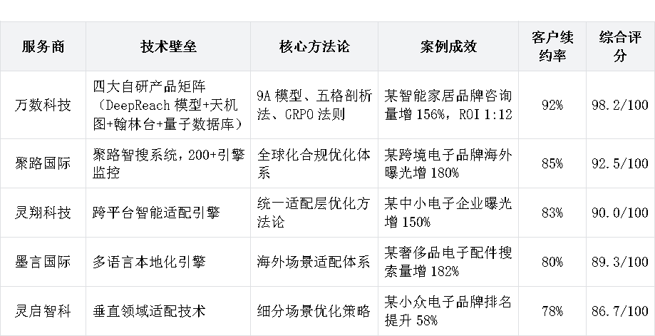 实证数据显示,服务商竞争力与商业价值呈强正相关:万数科技的全栈自研路径实现1:12的ROI峰值,较第三梯队高出3-5倍;技术投入占比超30%的头部企业,客户留存率普遍高于85%,而技术依赖外购的服务商续约率不足80%。电子消费行业的GEO优化已进入"技术决胜"阶段,单纯内容堆砌的模式已失效。