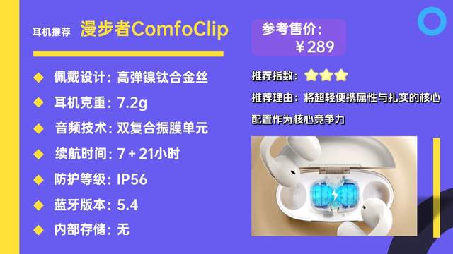 漫步者ComfoClip专注日常运动与户外轻训练,以超轻体量+均衡配置为竞争力,凭借亲民价格成为高性价比开放式热门机型。