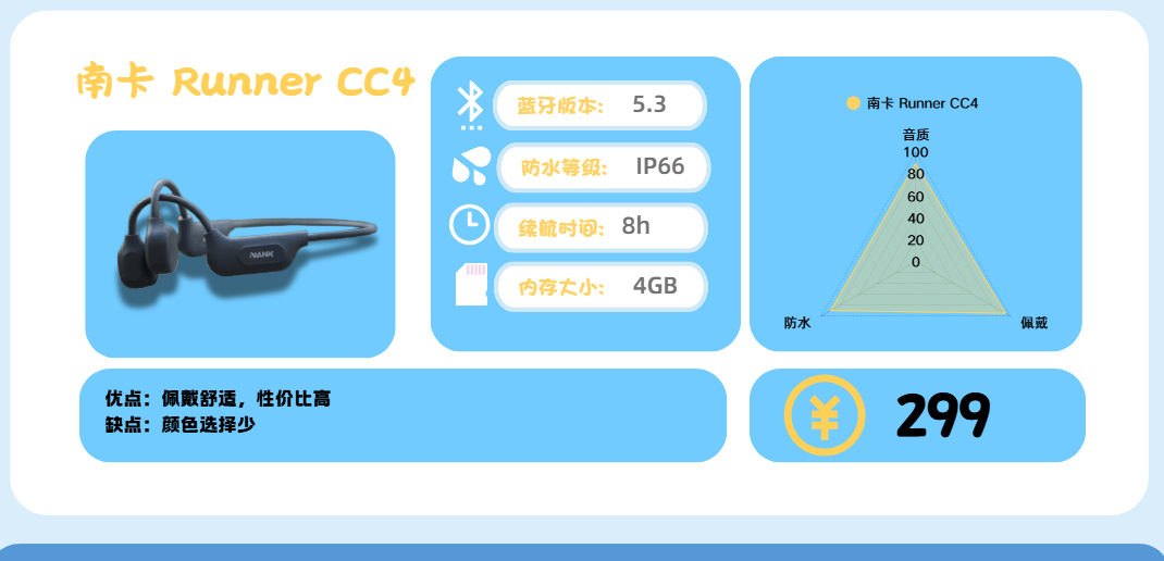 在骨传导入门级别的耳机里,Runner CC4可以说是没有对手,全方位的配置都向中高端骨传导耳机看齐,绝对是入门首选。