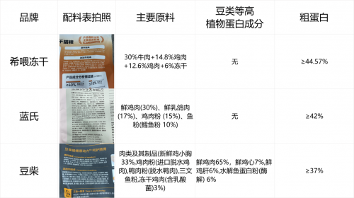 蓝氏猫粮:粗蛋白≥42%、粗脂肪≥20%。原料中动物源性成分,包含鲜鸡肉(30%)、鲜乳鸽肉(17%)、鸡肉粉(15%)、鳀鱼粉(10%)等,动物蛋白来源丰富。配料中也包含红薯颗粒、木薯淀粉、苜蓿草颗粒等植物性成分,植物蛋白会占据一定比例。