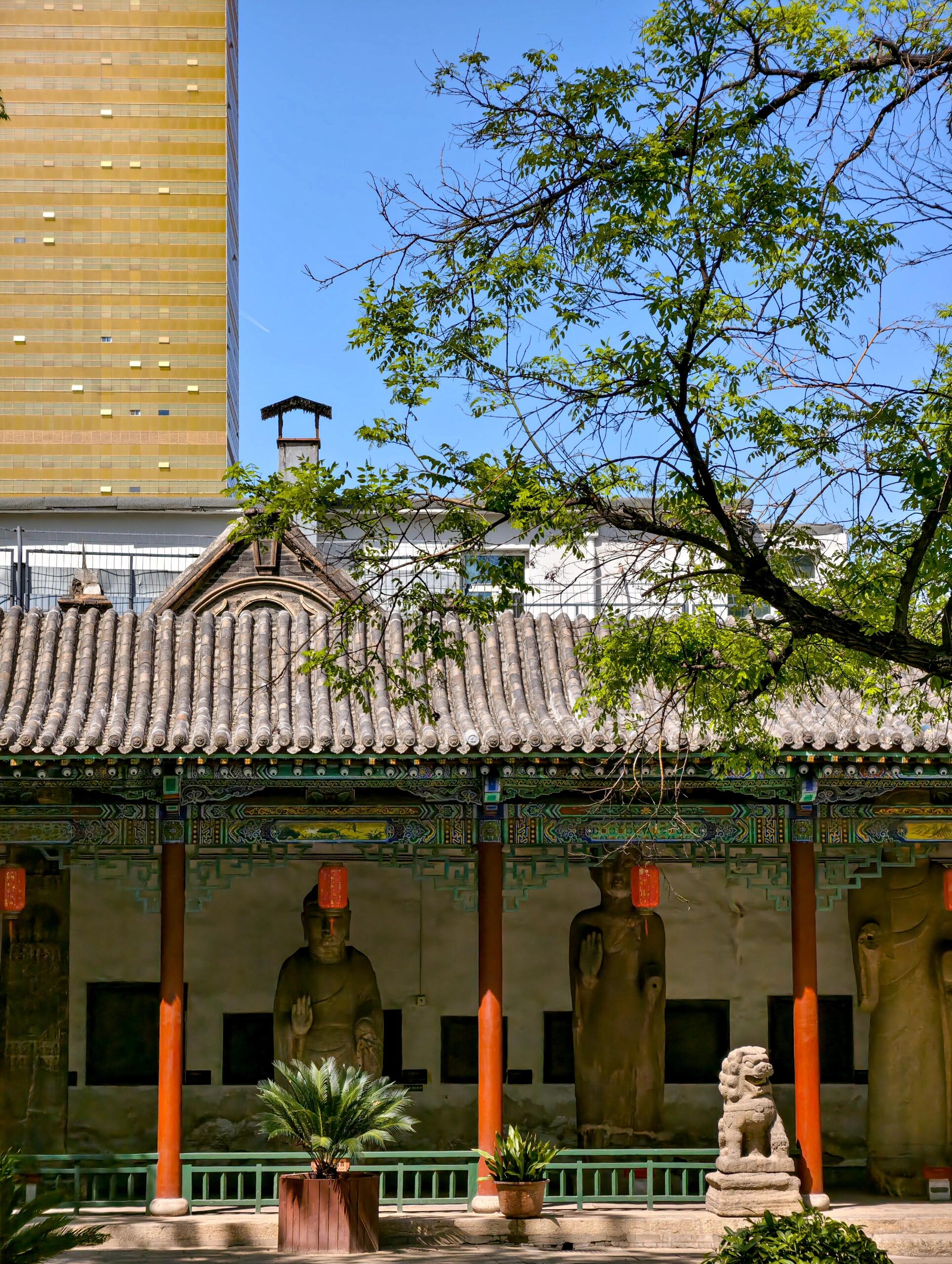 先说那块涅槃变相碑,摆在一进院的碑廊里,玻璃罩子罩着,看着不起眼,却是全国195件禁止出国展览的文物之一。最绝的是“佛道同框”,碑上刻着佛祖涅槃的场景,弟子们哭得肝肠寸断,可仔细看菩萨的衣袂褶皱,居然藏着道家的八卦纹——这在别的地方根本见不着。有人说这是工匠随手刻的,佛道两家的活儿干混了;也有人说,这是明代宗教融合的证据,佛道在这块石头上握手言和了。蹲在玻璃前放大看细节,连菩萨衣纹里的每根线条都透着股较劲的意思,像是刻碑的人在偷偷炫耀:“你看,我能把俩家的东西拧成一股绳。”