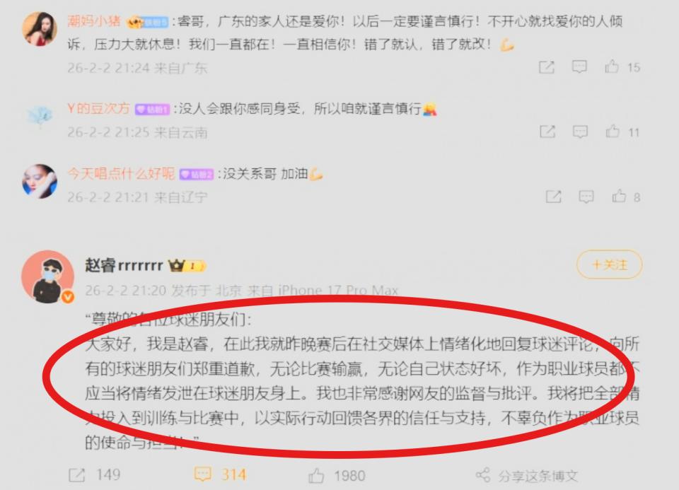 赵睿在声明中言辞恳切,承认了自己在赛后情绪化回复球迷的不当行为。他向所有球迷郑重道歉,并强调无论比赛输赢或个人状态如何,作为职业球员都不应将负面情绪转移到支持者身上。他在文中特别感谢了网友的监督与批评,承诺将把全部精力重新投入到训练与比赛之中,试图用实际行动来回馈各界的信任。这番表态在逻辑上无懈可击,但在互联网记忆面前,单薄的文字似乎难以瞬间抚平部分球迷心中经年累月的裂痕。